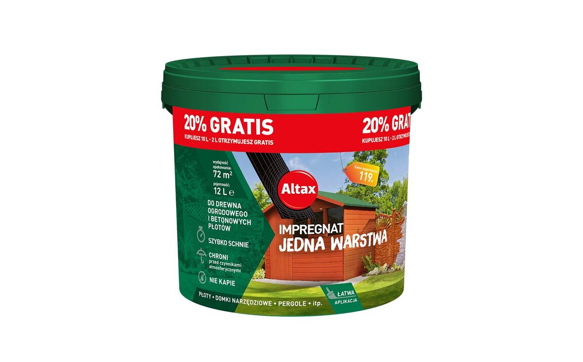 Altax Impregnat Jedna Warstwa do ochrony i dekoracji drewna ogrodowego i płotów betonowych. Jedna warstwa i szybkie schnięcie pozwalają ukończyć pracę w 1 dzień. Skutecznie zabezpiecza przed czynnikami atmosferycznymi: wodą, wilgocią, promieniowaniem UV. Posiada bardzo gęsta konsystencję, dzięki czemu nie kapie podczas malowania - jest bardzo łatwy w użyciu. Dzięki nowoczesnym żywicom i woskom produkt nie łuszczy się i nie pęka.