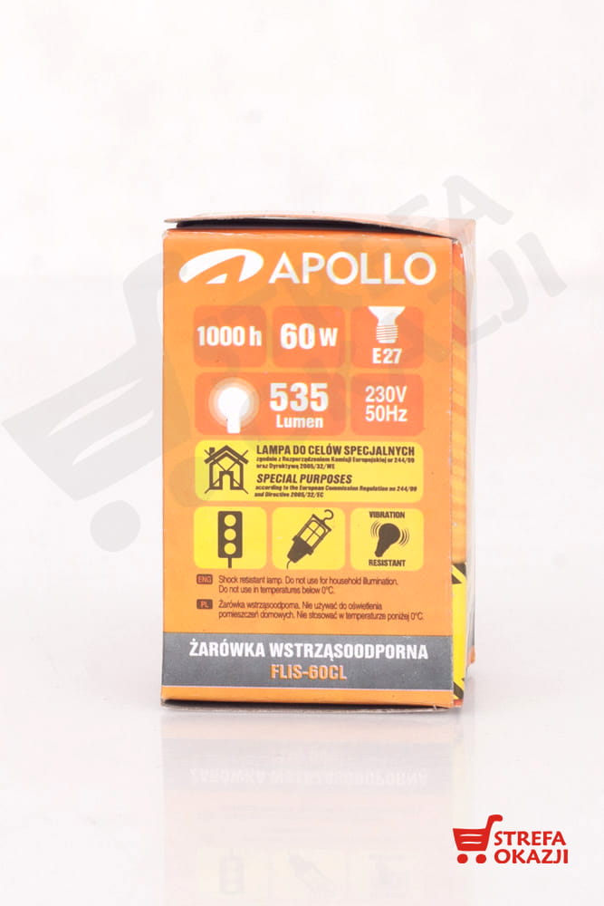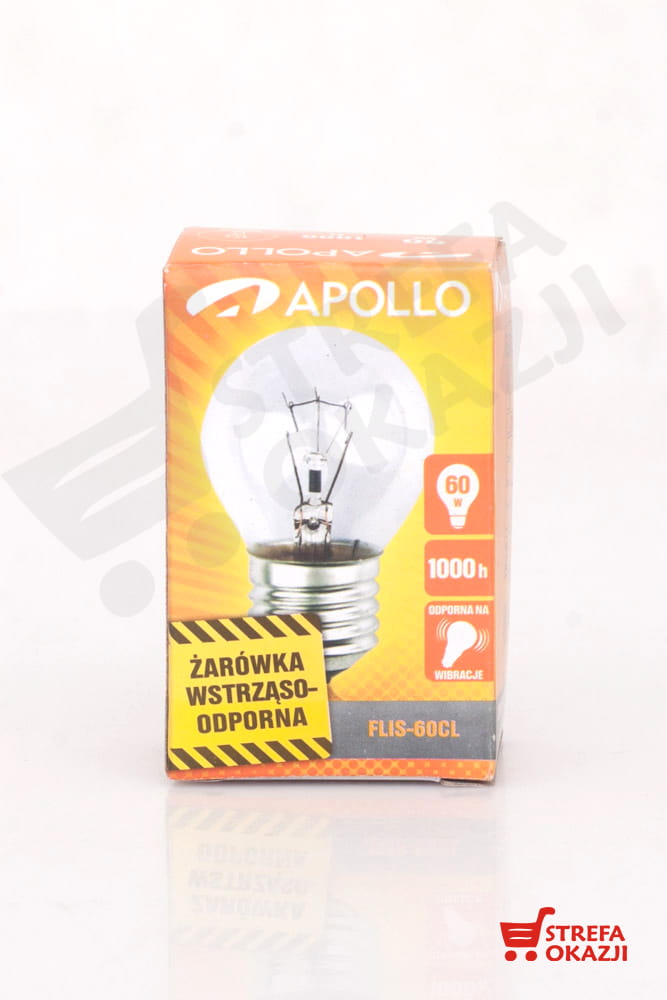Żarówki wstrząsoodporne Apollo charakteryzują się wzmocnioną konstrukcją wsporczą żarnika, zapewniającą wysoką odporność na różnego rodzaju wibracje oraz drgania. Wysokiej jakości żarnik wykonany z podwójnej skrętki, stabilizowany aż trzema ramkami zapewnia zwiększoną wytrzymałość i niezawodność w trudnych warunkach eksploatacyjnych. Solidna konstrukcja całej żarówki oraz całkowity brak emisji zakłóceń elektromagnetycznych czynią żarówki wstrząsoodporne Apollo niezastąpionymi w miejscach gdzie wymagane są źródła światła specjalnego przeznaczenia oraz o wysokiej odporności na warunki w których pracują. Bezpieczeństwo całego wyrobu podnosi wbudowany w żarówkę bezpiecznik. Żarówki wstrząsoodporne Apollo to źródła światła specjalnego ogólnego przeznaczenia znajdujące zastosowanie w transporcie lądowym, wodnym, taborze kolejowym, zakładach usługowych (np. w oświetleniu warsztatowym), jako wyrób budowlany (np. w dźwigach osobowych, towarowych), do oświetlania centrali wentylacyjnych i klimatyzacyjnych, oświetleniu sygnalizacyjnym oraz w tych zastosowaniach profesjonalnych w których wymagany jest brak emisji elekromagnetycznych EMC.