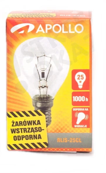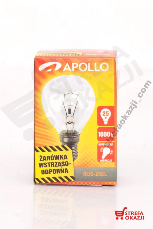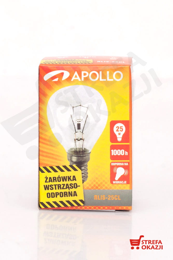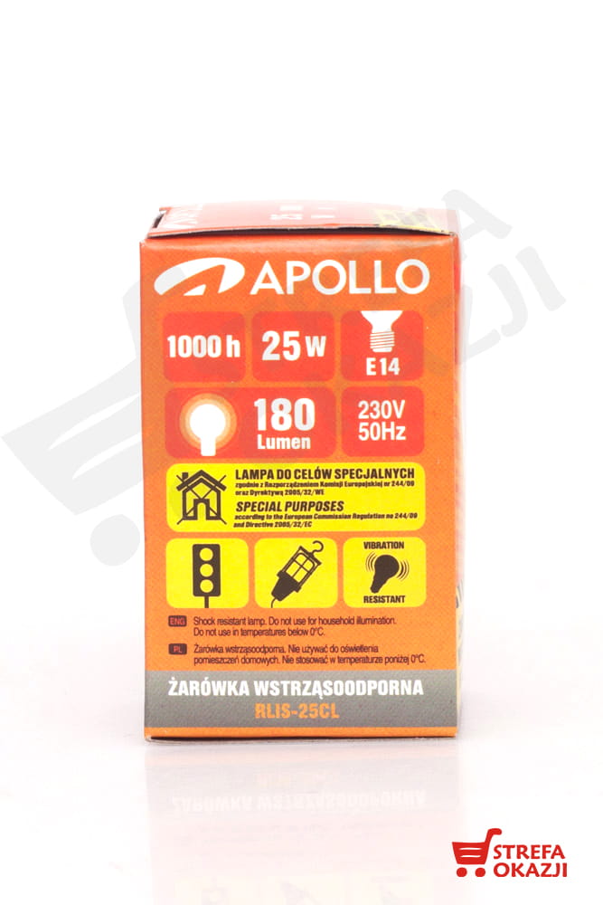 Żarówki wstrząsoodporne Apollo charakteryzują się wzmocnioną konstrukcją wsporczą żarnika, zapewniającą wysoką odporność na różnego rodzaju wibracje oraz drgania. Wysokiej jakości żarnik wykonany z podwójnej skrętki, stabilizowany aż trzema ramkami zapewnia zwiększoną wytrzymałość i niezawodność w trudnych warunkach eksploatacyjnych. Solidna konstrukcja całej żarówki oraz całkowity brak emisji zakłóceń elektromagnetycznych czynią żarówki wstrząsoodporne Apollo niezastąpionymi w miejscach gdzie wymagane są źródła światła specjalnego przeznaczenia oraz o wysokiej odporności na warunki w których pracują. Bezpieczeństwo całego wyrobu podnosi wbudowany w żarówkę bezpiecznik. Żarówki wstrząsoodporne Apollo to źródła światła specjalnego ogólnego przeznaczenia znajdujące zastosowanie w transporcie lądowym, wodnym, taborze kolejowym, zakładach usługowych (np. w oświetleniu warsztatowym), jako wyrób budowlany (np. w dźwigach osobowych, towarowych), do oświetlania centrali wentylacyjnych i klimatyzacyjnych, oświetleniu sygnalizacyjnym oraz w tych zastosowaniach profesjonalnych w których wymagany jest brak emisji elekromagnetycznych EMC.