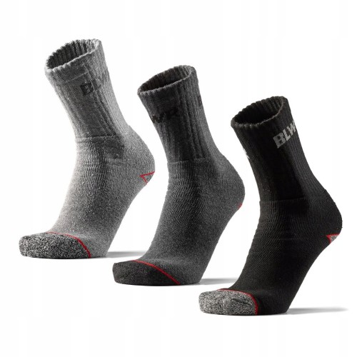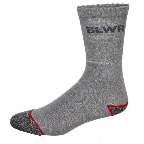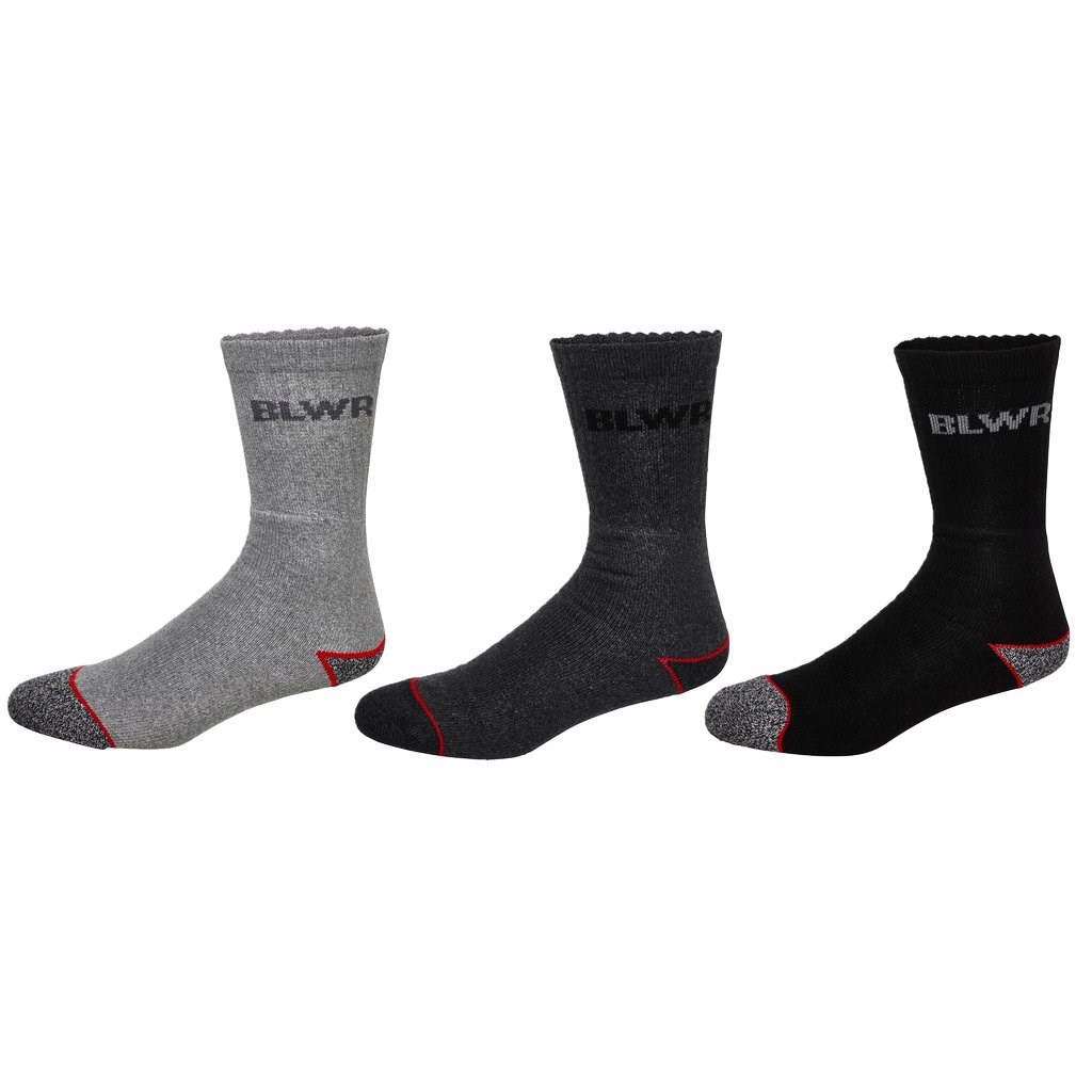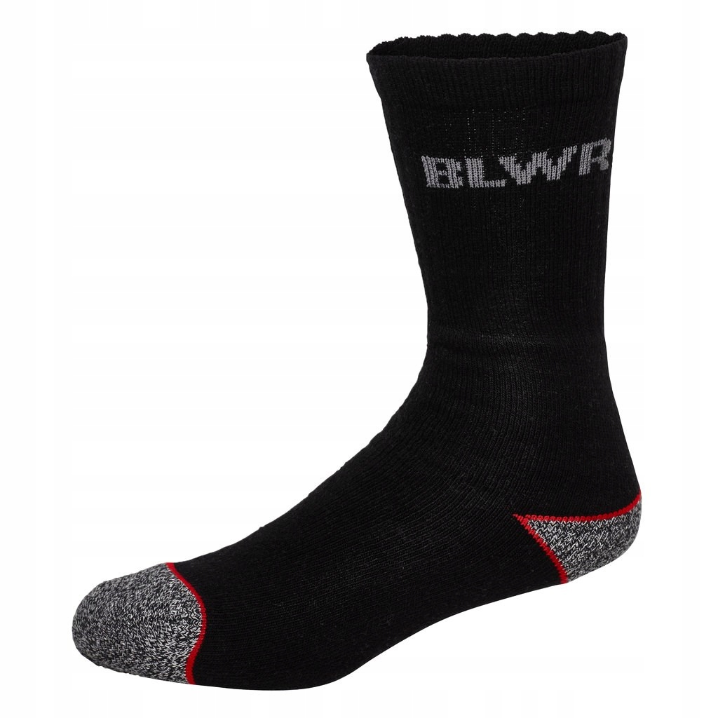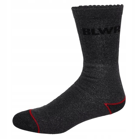 Wytrzymałe skarpety robocze marki Bluewear. Skarpety mają wysoką cholewkę i wzmocnienia na palcach i piętach, co zapewnia dodatkową ochronę. Są wykonane w 70% z bawełny i w 30% z poliestru. Są ponadto ładnie ozdobione w czarno-szarym zestawieniu kolorystycznym z czerwonymi detalami i logotypem marki Bluewear.