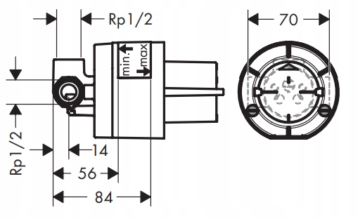 - Przyłącza Rp 1/2: Zimna z prawej - Ciepła z lewej