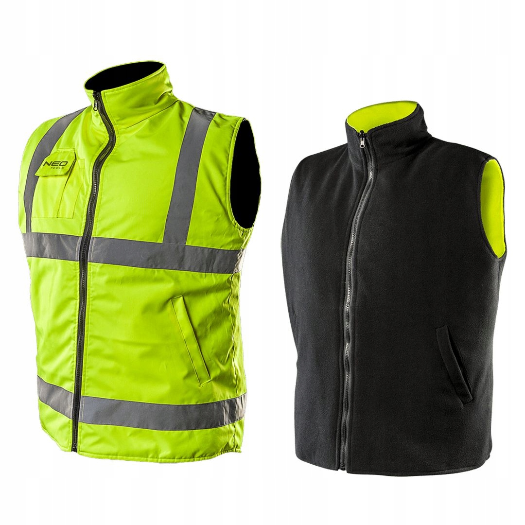 Ocieplany bezrękawnik roboczy, dwustronny NEO (nr ref 81-520-S) o intensywnej widzialności, to praktyczne rozwiązanie zwiększające bezpieczeństwo użytkownika, polegające na sygnalizowaniu jego obecności, w każdych warunkach oświetlenia dziennego jak i w ciemności w oświetleniu światłami pojazdów. Zewnętrzna strona bezrękawnika , wykonana została z trwałego wodoodpornego materiału fluorescencyjnego oraz z elementów odblaskowych, zapewniających widoczność odpowiadającą klasie 2, zgodnie z wymaganiami normy PN-EN ISO 20471:2013. Wewnętrzna strona wykonana z czarnego polaru, wysoka stójka oraz wydłużony tył zapewnia ciepło i komfort użytkowi w chłodne dni. Bezrękawnik posiada kieszeń na smartf Marka NEO spełnia oczekiwania profesjonalistów.ona i długopis po stronie ostrzegawczej i po dwie kieszenie w dolnej części na każdej stronie. Uniwersalność bezrękawnika docenią zawodowi kierowcy, pracownicy budowlani jak i zwykli użytkownicy. Gwarancją jakości jest certyfikat europejski CE.