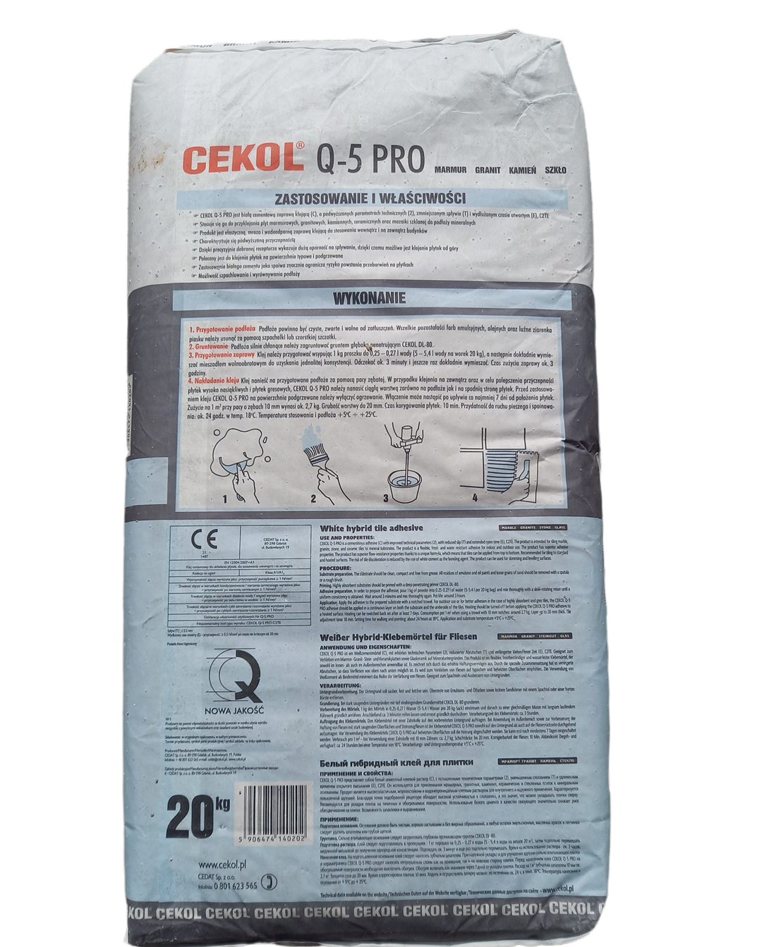 CEKOL Q-5 PRO jest białą cementową zaprawą klejącą (C), o podwyższonych parametrach technicznych (2), zmniejszonym spływie (T) i wydłużonym czasie otwartym (E), C2TE. Produkt jest elastyczną, mrozo i wodoodporną zaprawą klejącą do stosowania wewnątrz i na zewnątrz budynków. Charakteryzuje się podwyższoną przyczepnością. Dzięki precyzyjnie dobranej recepturze wykazuje dużą oporność na spływanie, dzięki czemu możliwe jest klejenie płytek od góry.