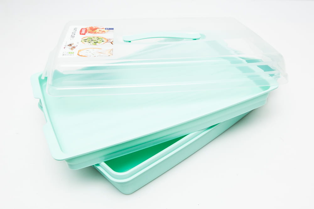 Pojemnik wykonany z tworzywa sztucznego.Szerokość pojemnika (wymiary od środka): 40 cm x 27 cm x 81,5H cm. W środku znajduje się specjalna tacka, która po odwróceniu daje nam jeszcze jeden poziom. Np na drugiego placka. Bardzo wytrzymały i praktyczny. W kolorze seledynowym .