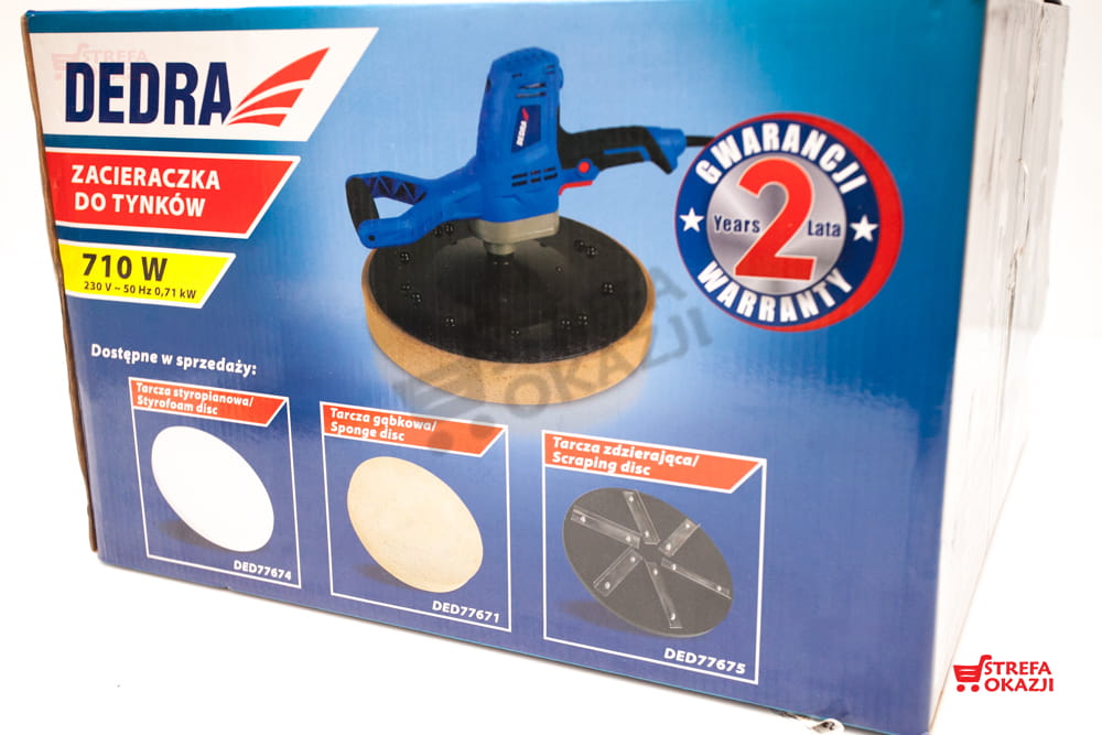 Zacieraczka DEDRA DED7767 jest wielofunkcyjnym urządzeniem do obróbki powierzchni ścian. Zdecydowanie ułatwia i przyśpiesza pracę operatora dodatkowo efekt pracy jest o wiele lepszy niż przy użyciu tradycyjnych narzędzi ręcznych. W zależności od zastosowanej tarczy może być stosowana do takich prac jak: Zacieranie tynków cementowo-wapiennych oraz gipsowych. Wykańczanie powierzchni ścian poprzez zacieranie "kwarcem" lub tynkiem cienkowarstwowym wapiennym. Zdzieranie starych powłok ze ściany: farba, tapeta lub wierzchnia warstwa tynku.