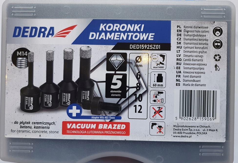 Zestaw 4 koronek diamentowych Vacuum Brazed przeznaczonych do wykonywania otworów w płytkach ceramicznych, gresie,betonie, cegle, szkle, asfalcie, laminatach, PCV, stali, metalach nieżelaznych, drewnie itp. Technologia Vacuum Brazed gwarantuje dużą czystość, wytrzymałość połączenia ziaren diamentu z osnową i korpusem. Brak lutowanych czy spawanych laserowo elementów (segmentów diamentowych), które mogą zostać oderwane od korpusu podczas pracy, zapewniają bezpieczeństwo pracy narzędziem. Zastosowanie gwintu M14 umożliwia montaż koronki do każdej szlifierki kątowej. Koronki VB mogą być przeznaczone do pracy na sucho i mokro. W zestawie adapter M14 do HEX, dzięki czemu można wykorzystać koronki diamentowe z wiertarkami.