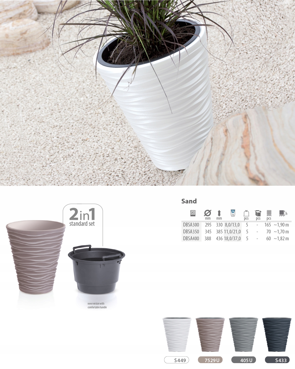Z myślą o harmonijnym i atrakcyjnym krajobrazie, stworzyliśmy wielosezonową, mrozoodporną kolekcję Sand i Sandy, łączącą atmosferę i komfort, funkcjonalność i design. To wyjątkowo dekoracyjne donice, inspirowane ręcznie modelowaną tradycyjną ceramiką o powierzchni uszlachetnionej łagodnie falującymi pionowymi lub poziomymi żłobieniami, uformowanymi na wzór pustynnego piachu. Są ukoronowaniem publicznej strefy wypoczynkowej, otoczenia hoteli i rezydencji. Stanowią doskonałe uzupełnienie aranżacji tarasów, ogrodów zimowych i tak popularnych patio. Wykazują też zwiększoną wytrzymałość na działanie promieni słonecznych i niskich temperatur oraz dużą odporność na uszkodzenia mechaniczne.