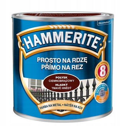 Emalia Hammerite w kolorze ciemnobrąowy połysk to nowoczesna, jednoskładnikowa farba, schnąca na powietrzu, przeznaczona do antykorozyjnego i dekoracyjnego malowania metali żelaznych (stal, żeliwo), znajduje zastosowanie do balustrad, bramek, drzwi, ogrodzeń i płotów. Farba znajduje zastosowane w przypadku metali żelaznych czystych, jak również tych pokrytych rdzą. Hammerite można użyć również do zabezpieczenia metali nieżelaznych po odpowiednim zagruntowaniu. Efekt w postaci gładkiego połysku zapewnia niepowtarzalne walory estetyczne i długotrwałą ochronę antykorozyjną. Nowoczesna technologia DUALTECH odpycha wodę i zapobiega powstawaniu rdzy. Cechuje się szybkim schnięciem oraz wydajnością, tj. 1 litr farby wystarcza na pomalowanie do 7 m2 powierzchni. Farba Hammerite gwarantuje do 8 lat ochrony przed powstawaniem rdzy.