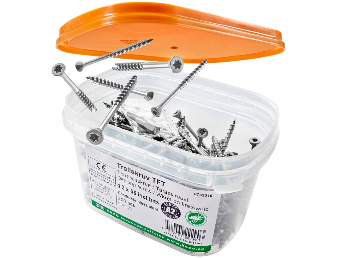 Wkręty tarasowe z łbem stożkowym i nacięciem Torx marki Heco są wykonane ze stali nierdzewnej (A2) i zaliczone do klasy korozyjności 4, co sprawia, że są bardzo odporne na działanie czynników atmosferycznych.