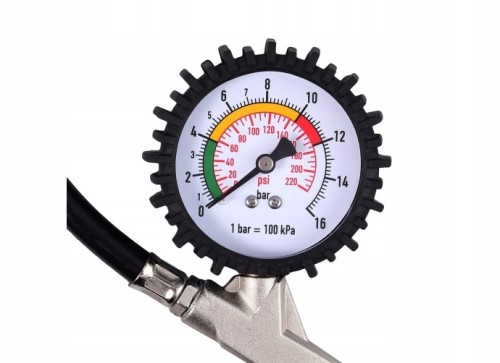 - Wyposażony jest w precyzyjny manometr, obudowany gumą co zabezpiecza go przed uszkodzeniem