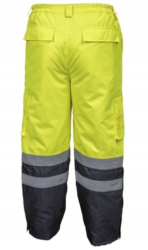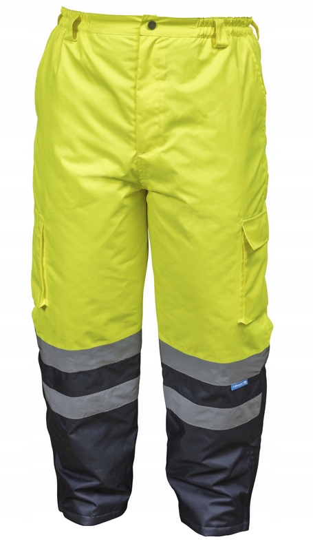 Wykonana zgodnie z normą CE. Podszewka wykonana z 100% poliestru, 190T tafta. Warstwa zewnętrzna: splot Oxford 300D, powlekana PU. Ocieplenie o gramaturze 170g/cm2. Wodoodporność 2000mm. Taśmy odblaskowe zapewniają widoczność w trudnych warunkach. 2 kieszenie górne, 2 kieszenie boczne naszywane: 1 kieszeń z patką na rzep, druga zapinana na rzep z dodatkowymi małymi kieszeniami. Dwie kieszenie z tyłu z patkami na rzep. Dopasowane w talii poprzez gumkę. Nogawki u dołu zapinane na zamek z plisą. Kolor żółto-granatowy. Miękki materiał i wygodny krój gwarantujący komfort użytkowania. Modny design. Wykonana z lekkich i wytrzymałych tkanin. Ochrona indywidualna kategorii II. Produkt zgodny z normą określającą wymagania ogólne odzieży ochronnej - EN ISO 13688 oraz z normą o odzieży o intensywnej widzialności - EN ISO 20471.