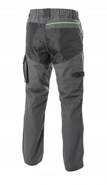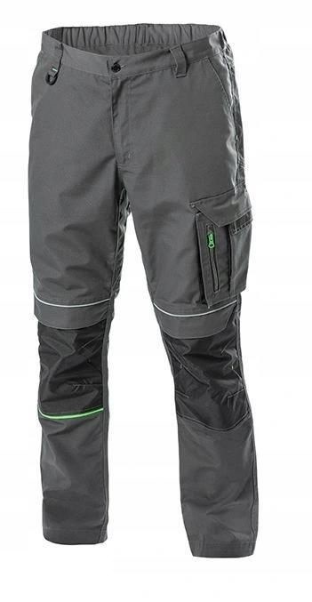 Spodnie dostępne są w modnym ciemnoszarym kolorze z zielonymi akcentami i szerokiej gamie rozmiarów (od S do 3XL). Idealne dla pracowników produkcyjnych oraz budowalnych. Polecane również monterom, serwisantom oraz technikom.