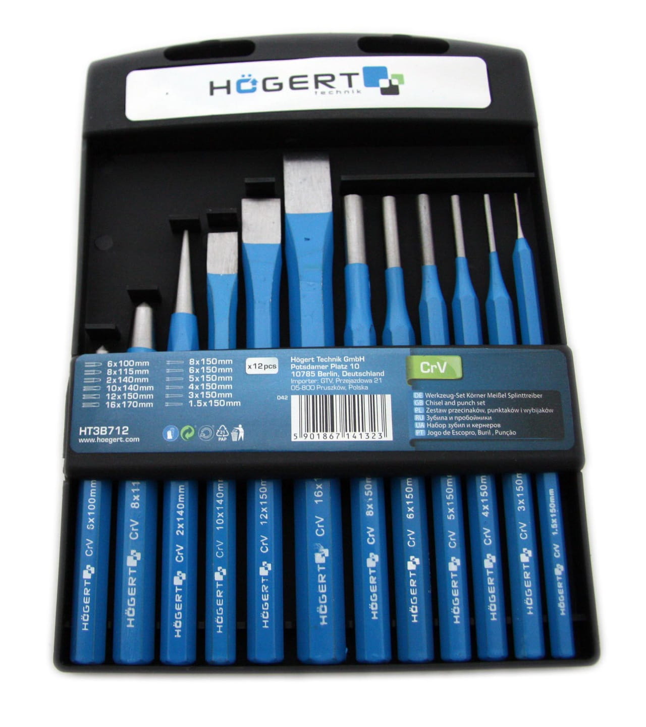 Zestaw dwunastu sztuk przecinaków, punktaków i wybijaków przeznaczonych do cięcia, punktowania i wybijania twardych materiałów oraz innych prac mechanicznych i ślusarskich. Narzędzia posłużą głównie do zaznaczania środka otworów przed wierceniem, do cięcia blachy i prętów oraz wybijania elementów metalowych. Cały komplet wykonany jest z najwyższej jakości stali chromowo-wanadowej. Zestaw został zapakowany w wygodne, plastikowe pudełko, co ułatwia przechowywanie i transport.