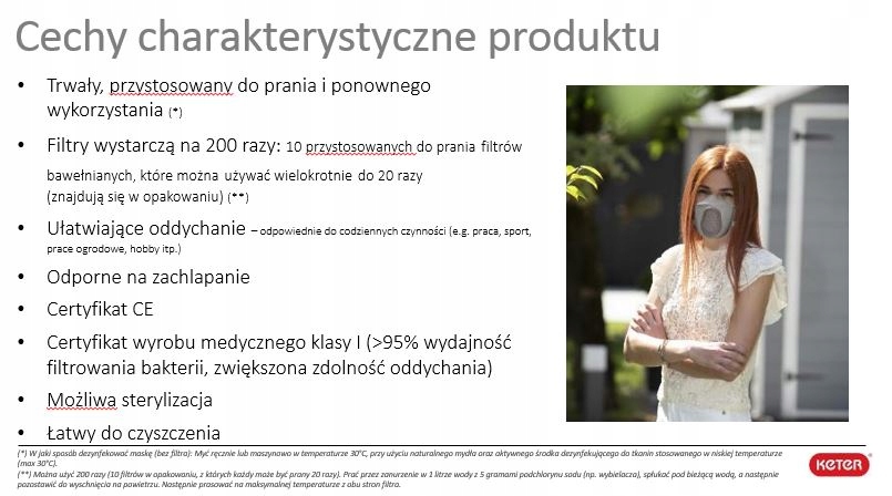OCHRONNA MASECZKA SŁUŻY DO ZASŁANIANIA NOSA I TWARZY OPATRZONA CERTYFIKATEM CE I NADAJE SIĘ DO DEZYNFEKCJI PO KAŻDYM UŻYCIU, AŻ DO OSŁABIENIA STRUKTURY PRODUKTU. OPAKOWANIE ZAWIERA JEDNĄ MASECZKĘ Z TPE (MIĘKKIEGO TWORZYWA DO ZASTOSOWAŃ MEDYCZNYCH) O WYMIARACH 12,7X7,5X13,7 ORAZ 10 FILTRÓW BAWEŁNIANYCH. OKRAS PRZYDATNOŚCI DO UŻYTKOWANA 2 LATA