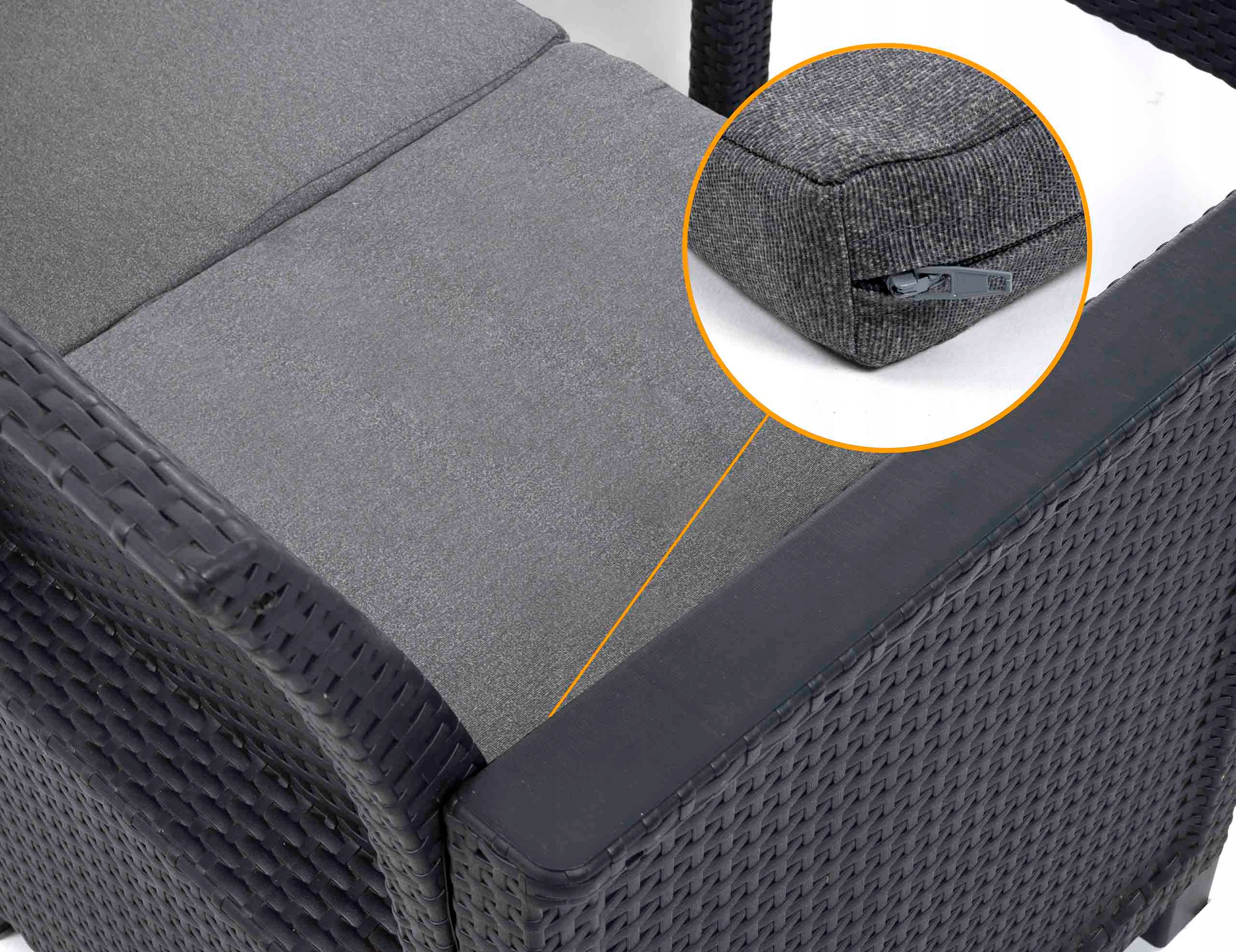 W skład zestawu wchodzą poduszki na siedziska z zamkiem błyskawicznym. Poszycie poduszek są w modnym szarym kolorze.