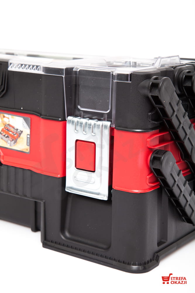 Praktyczna 3-poziomowa skrzynka o dużej pojemności. Każdy poziom produktu dostosowany jest do przechowywania różnej wielkości narzędzi i akcesoriów. Wnętrze ułatwia przechowywanie narzędzi w różnych rozmiarach. Dzięki wygodnej rączce skrzynkę można bez problemu transportować. Skrzynka została wyposażona w tylne nogi, które są podporą jej konstrukcji w trakcie użytkowania. Produkt został wykonany z wysokiej jakości materiałów, co zapewnia jego trwałość i wytrzymałość.