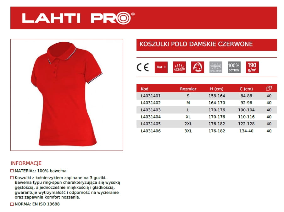 Koszulki polo damskie polskiej marki Lahti Pro do doskonały wybór dla kobiet które lubią wygodę i modny wygląd. Koszulki polo damskie doskonale nadają się jako część sportowego stroju który sprawdzi się w każdych warunkach. Coraz częściej kobiety również zaczynają wychodzić w nich na miasto lub na spotkania z przyjaciółmi ponieważ koszulka polo łączy ze sobą elegancję oraz prostotę i w połączeniu z ciekawymi dodatkami wygląda bardzo efektownie. Koszulki polo damskie to must have każdej kobiety lubiącej sportowy styl, który jednak nie jest pozbawiony odrobiny fantazji. W sklepie Lahti Pro znajdziesz duży wybór koszulek polo. Nasze koszulki polo wykonane są z wysokiej jakości 100% bawełny o gramaturze 190g/m2. Koszulka z kołnierzykiem zapinana na 3 guziki. Bawełna typu Ring Spun charakteryzująca się wysoką gęstością, a jednocześnie miękkością i gładkością, gwarantuje wytrzymałość i odporność na wycieranie, oraz zapewnia komfort noszenia. Koszulka Polo posiada deklarację CE oraz spełnia postanowienia normy EN ISO 13688. Jest w pierwszej kategorii środków ochrony indywidualnej.
