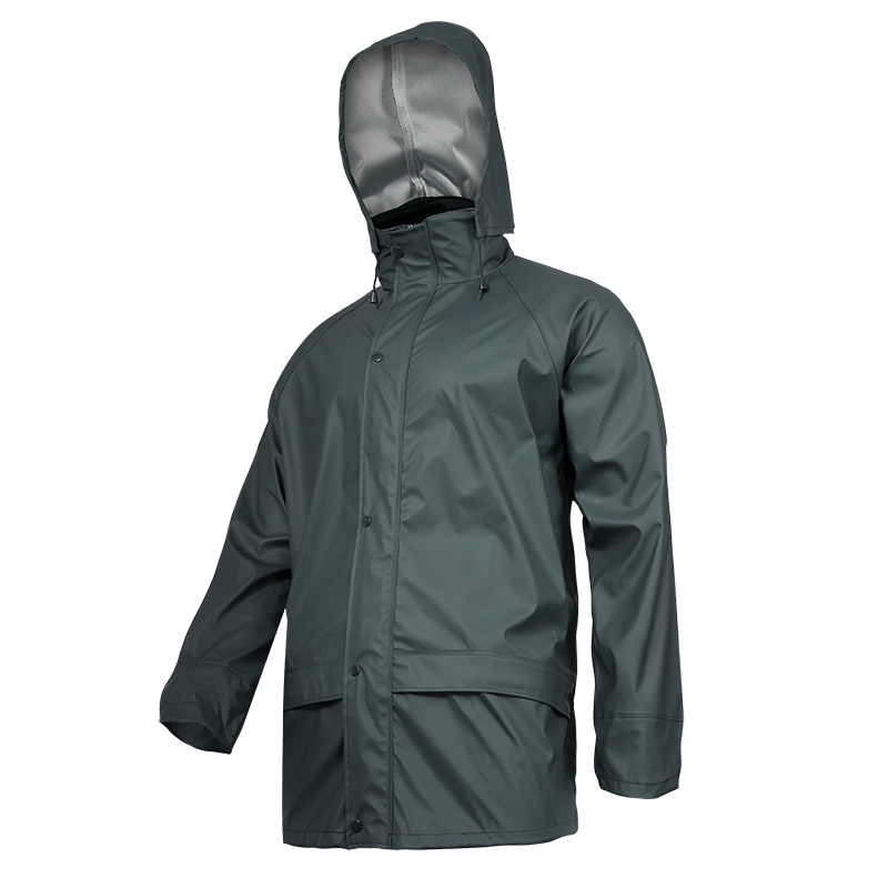 Kurtkę przeciwdeszczową marki Lahti Pro L40918 w kolorze zielonym wykonano z bardzo lekkiego i i odpornego na uszkodzenia mechaniczne stu procentowego poliuretanu. Otwory wentylacyjne pod pachami zwiększają cyrkulację powietrza. Wodoodporny kaptur z regulacją chowany w kołnierzu zamykanym na suwak. Mankiety zakończone wewnętrznym elastycznym ściągaczem chroniącym przed wiatrem i wodą. Regulacja dołu kurtki za pomocą ściągacza. Zamek błyskawiczny z dodatkową klapką zapinaną na napy. Kurtka posiada dwie kieszenie zewnętrzne. Odzież marki Lahti Pro posiada deklarację zgodności CE. Spodnie są w pierwszej kategorii środków ochrony indywidualnej oraz spełniają normę EN ISO 13688.