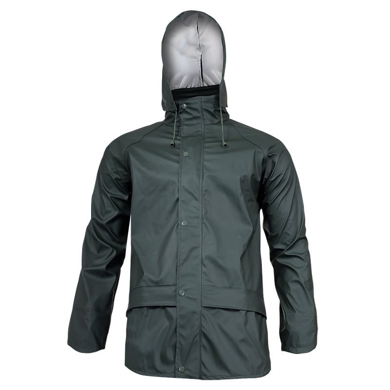 Kurtkę przeciwdeszczową marki Lahti Pro L40918 w kolorze zielonym wykonano z bardzo lekkiego i i odpornego na uszkodzenia mechaniczne stu procentowego poliuretanu. Otwory wentylacyjne pod pachami zwiększają cyrkulację powietrza. Wodoodporny kaptur z regulacją chowany w kołnierzu zamykanym na suwak. Mankiety zakończone wewnętrznym elastycznym ściągaczem chroniącym przed wiatrem i wodą. Regulacja dołu kurtki za pomocą ściągacza. Zamek błyskawiczny z dodatkową klapką zapinaną na napy. Kurtka posiada dwie kieszenie zewnętrzne. Odzież marki Lahti Pro posiada deklarację zgodności CE. Spodnie są w pierwszej kategorii środków ochrony indywidualnej oraz spełniają normę EN ISO 13688.