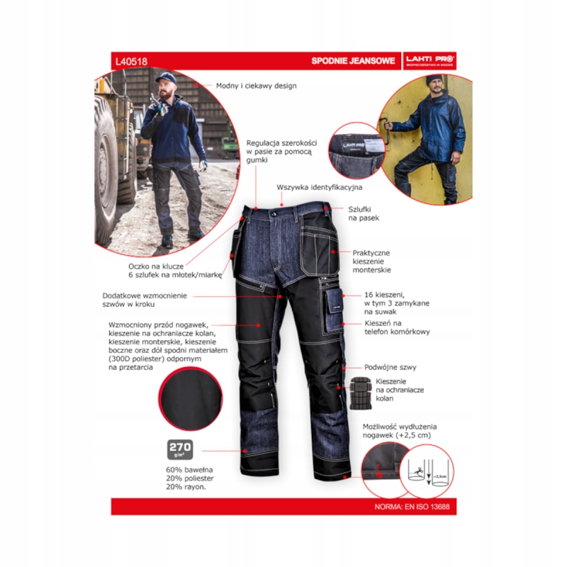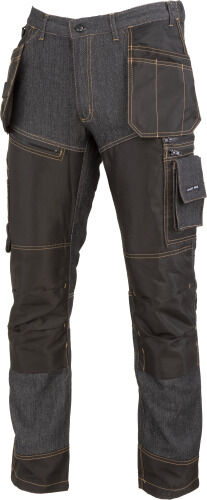 - Wzmocniony przód nogawek, kieszenie na ochraniacze kolan, kieszenie monterskie, kieszenie boczne oraz dół spodni materiałem (300D poliester) odpornym na przetarcia