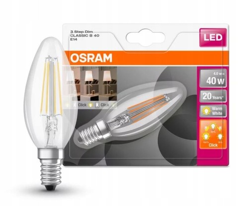 Żarówka LED w kształcie świecy o gwincie E14, to wysokiej jakości źródło światła marki OSRAM. Żarówka LED Filament wyróżnia trójstopniowe ściemnianie, które możliwe jest poprzez wielokrotne naciskanie przełącznika ściennego. Żarówka LED E14 emituje światło o mocy 5W, strumieniu świetlnym 470 lm, oraz białej ciepłej barwie światła - 2700 K. Żarówki o tej barwie są najczęściej stosowanymi w domach i mieszkaniach, gdyż relaksują i wprawiają w dobry nastrój. Świeczka LED za sprawą przezroczystego szkła oraz pięknie prezentujących się diod jest doskonałym rozwiązaniem do instalacji dekoracyjnych. Żarówka ściemnialna to idealne rozwiązanie w niemal każdym wnętrzu, które pozwala dopasować jasność światła do własnych potrzeb.
