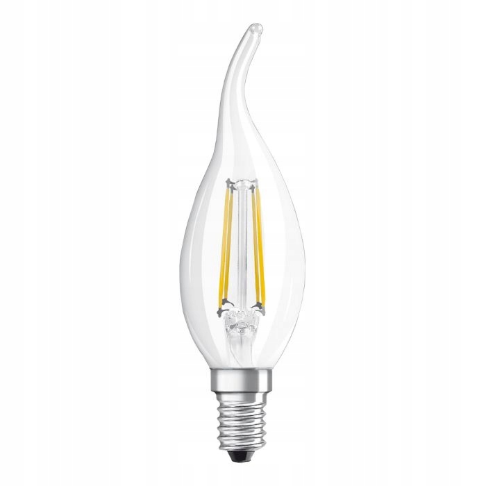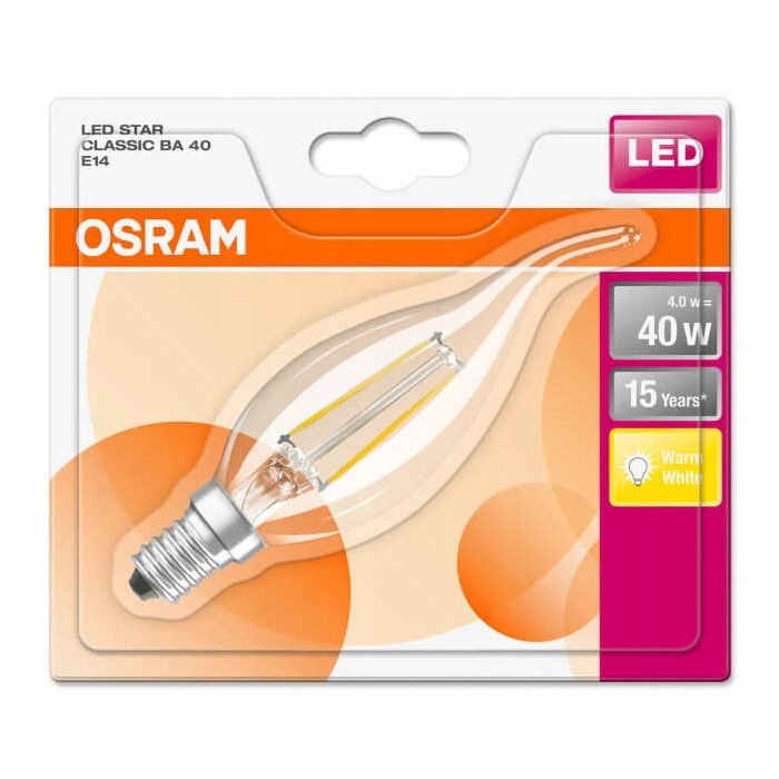 ŻARÓWKA LED Filament PŁOMYK z serii STAR uznanej na rynku marki OSRAM to nowoczesne dekoracyjne źródło światła LED z gwintem E14 o mocy 4W (jest to odpowiednik klasycznych żarówek o mocy 40W). Zamknięta bańce BA35 żarówka emituje światło o ciepłej barwie 2700K, zaś strumień świetlny wynosi 470lm. Firma OSRAM korzystając z innowacyjnej technologii włókien LED w swoich żarówkach gwarantuje nam wydajność i rzeczywiste oddawanie barw na bardzo wysokim poziomie. Największą zaletą żarówek ledowych jest zmniejszony pobór energii nawet o 90% względem klasycznych źródeł światła. Ponadto oprócz kształtu bańki przypominającą świeczkę, wewnątrz znajdują się imitujące żarniki dekoracyjne diody LED, które nadadzą klasycznego charakteru Twoim wnętrzom. Prezentowana ŻARÓWKA LED z gwintem E14 marki OSRAM idealnie sprawdzi się jako oświetlenie ogólne jak i dekoracyjne w naszych domach czy mieszkaniach. Wybierając żarówki OSRAM z serii PARATHOM RETROFIT CLASSIC BA możemy być pewni, że otrzymamy produkt profesjonalnie wykonany, który zapewni nam bardzo długi czas pracy.