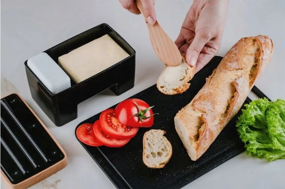 Nowoczesny design. Projekt maselniczki zyskał aprobatę nie tylko wśród klientów ale także uzyskał tytuł Finalista Roku Konkursu Dobry Wzór 2017. Pudełko, do którego wkładamy masło to w istocie pojemnik z pływakiem. Pływak wypiera wodę, którą nalewamy do wewnątrz. Woda zakrywa masło. W ten sposób zabezpieczamy tłuszcz przed kontaktem z powietrzem. Woda utrzymuje stałą i optymalna temperaturę masła, które jest miękkie i smaczne w odróżnieniu od masła, które zazwyczaj wyjmujemy rano z lodówki. Dobrej jakości masło zawiera niezbędne dla naszego zdrowia witaminy rozpuszczalne w tłuszczu – witaminę A i witaminę D. Warto je jeść i to jeść ze smakiem!