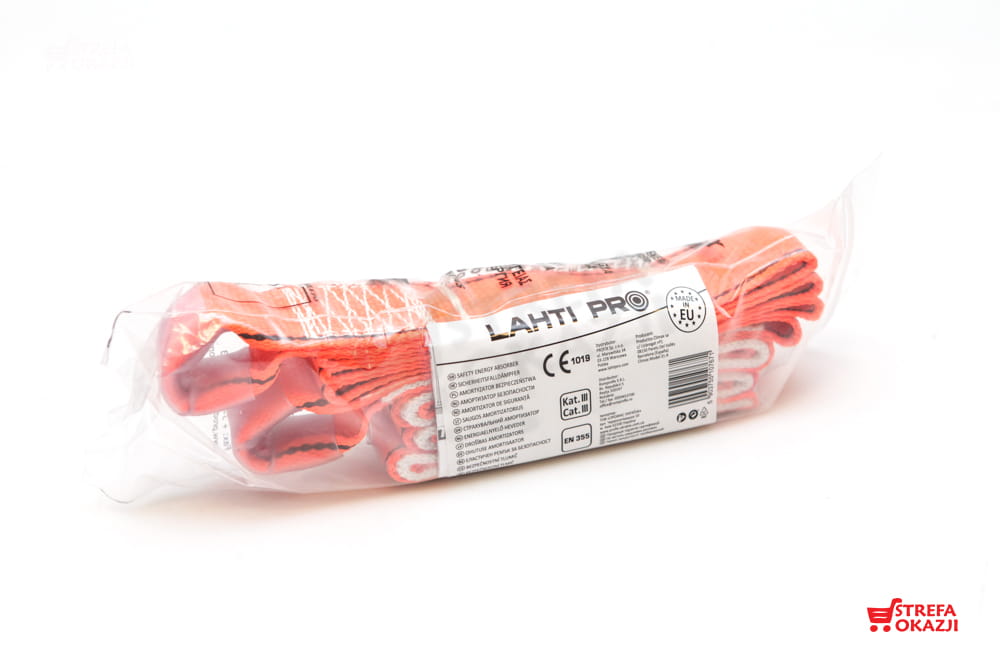 Amortyzator bezpieczeństwa Lahti Pro L8020100. Całkowita długość urządzenia 1,5 m. Amortyzator wykonany z taśmy poliamidowej. Zakończenia taśmy zszyte oraz pokryte rękawem ochronnym. Urządzenie posiada certyfikat CE. Amortyzatory bezpieczeństwa są składnikiem osobistego sprzętu chroniącego przed upadkiem z wysokości zgodnym z normą EN 355. Posiadają deklarację zgodności CE oraz trzeci najwyższy poziom środków ochrony indywidualnej.