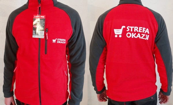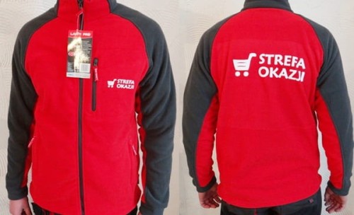 Ciepła bluza polarowa z możliwością nadruku własnego logo, na przedniej i tylnej części bluzy z technologią znakowania termotransfer flock w kolorze białym + istnieje możliwość nadruku w innym kolorze: czerwony i czarny, tylko na specjane zamówienie klienta. Logo będzie zamieszczone na przedniej i tylnej części bluzy polarowej o maksymalnych wymiarach formatu A4+A6. (A4 tył +A6 przód)