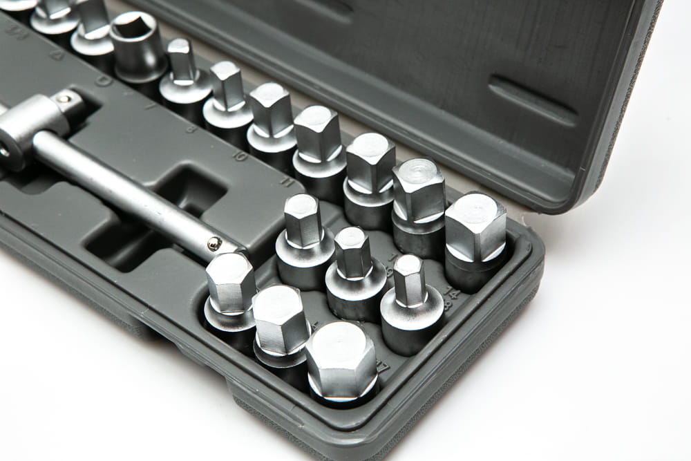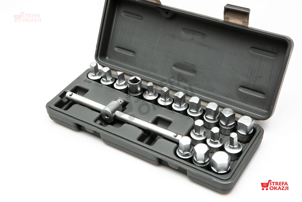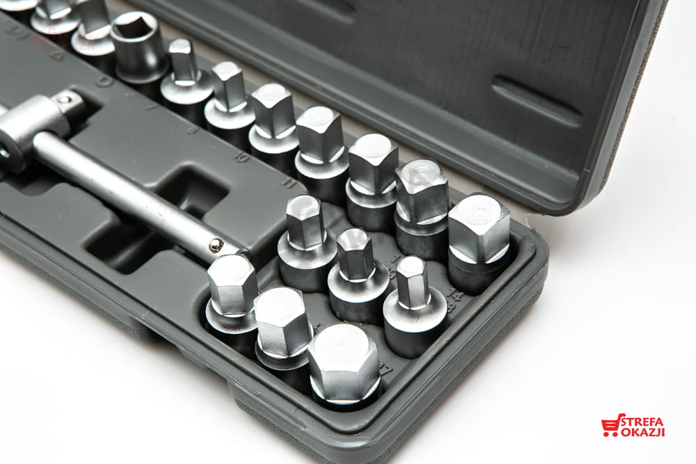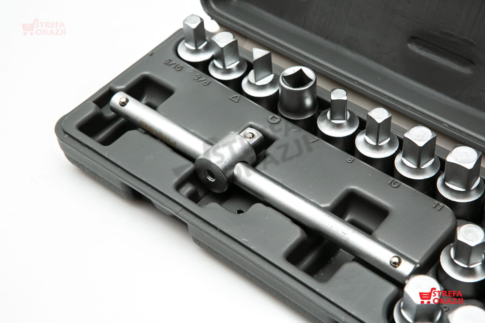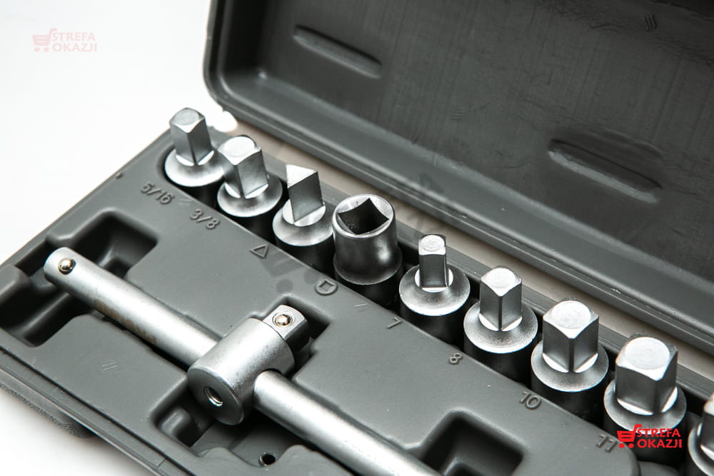 W zestawie znajduje się kompletna, typowa rozmiarówka kluczy sześciokątnych oraz kwadratowych. Zarówno metrycznych jak i calowych