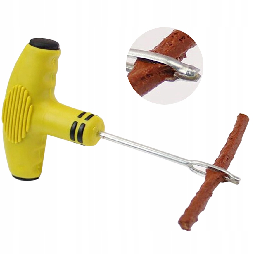 3. Załączony klej rozprowadź na sznurze, przyspieszy to proces wulkanizacji. Następnie przewlecz sznur przez szydło i zdecydowanym ruchem wepchnij szydło w otwór po przebiciu, min. 2/3 długości sznura musi być umieszczona w oponie. Ruch wykonaj zgodnie z kątem uszkodzenia. Wyciągnij szydło z opony unikając przekręcenia.