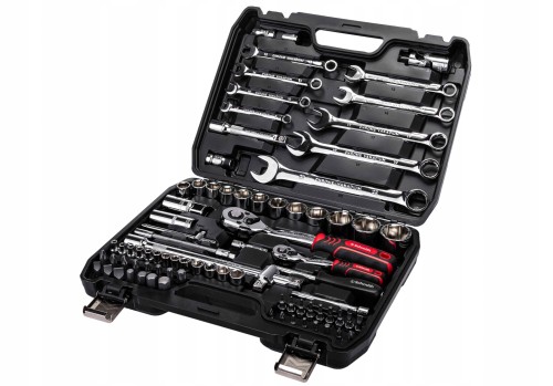 Komplet 82 kluczy nasadowych wykonanych z wysokojakościowej stali chromowo-wandowej (Crv) wytrzymałej na naprężenie statyczne i kinetyczne. Wygodna rękojeść oraz unikalna powłoka na powierzchni znacząco zwiększa komfort pracy oraz pozwala na utrzymanie narzędzi w czystości. Odchylona płaszczyzna robocza ułatwia manewrowanie kluczem. Klucze przeznaczone są do prac nawet w najcięższych warunkach pod dużym obciążeniem.