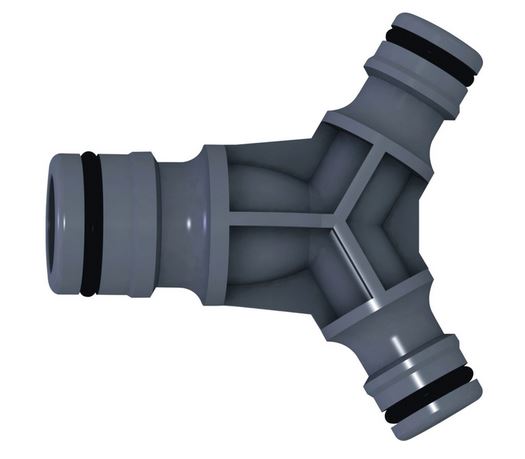 Trójnik pozwala na wygodne rozgałęzianie węży. Można prowadzić różne prace w ogrodzie w tym samym czasie, np. zraszać trawnik i podlewać rabaty kwiatowe. Trójnik posiada wyjścia 1/2 - 1/2 - 1/2 cala.