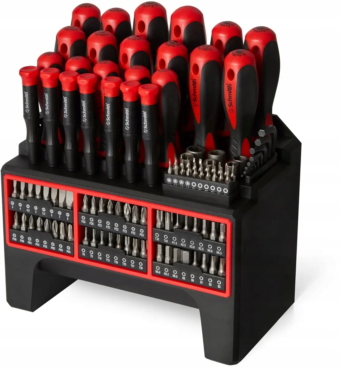 Zestaw wkrętaków Schmith 114 sztuk to wszechstronny zestaw narzędzi przeznaczony do różnorodnych prac montażowych. Narzędzia wykonane z wysokiej jakości stali S2 z magnetycznymi końcówkami zapewniają trwałość i precyzję. Ergonomiczne rękojeści z trójkolorowym wykończeniem zapewniają komfort użytkowania podczas długotrwałej pracy. Zestaw idealnie nadaje się do użytku profesjonalnego oraz domowego.