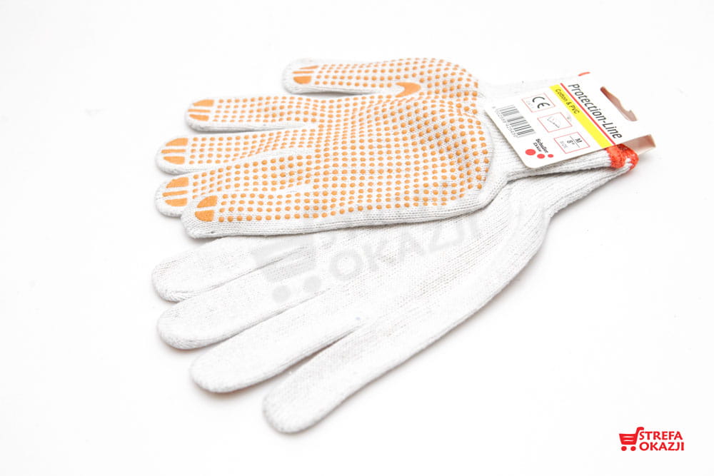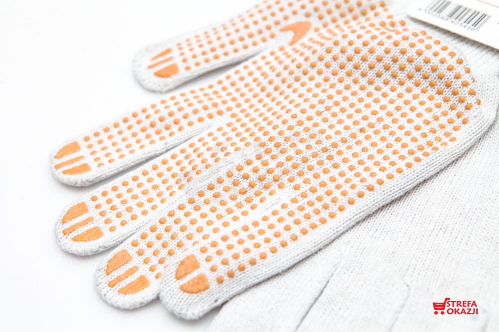 Bawełniane, strona chwytna nakrapiana PCV, dopasowany krój, dobra chwytność.