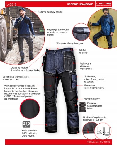 MATERIAŁ: 60% bawełna, 20% poliester, 20% rayon. 16 kieszeni, w tym 3 zamykane na suwak. Praktyczne kieszenie monterskie. Kieszeń na telefon komórkowy. Podwójne szwy. Dodatkowe wzmocnienie szwów w kroku. Regulacja szerokości w pasie za pomocą gumki. Możliwość wydłużenia nogawek (+2,5 cm). Oczko na klucze. 6 szlufek na młotek/miarkę. Szlufki na pasek. Wzmocniony przód nogawek, kieszenie na ochraniacze kolan, kieszenie monterskie, kieszenie boczne oraz dół spodni materiałem (300D poliester) odpornym na przetarcia. Modny i ciekawy design. Wszywka identyfikacyjna. NORMA: EN ISO 13688
