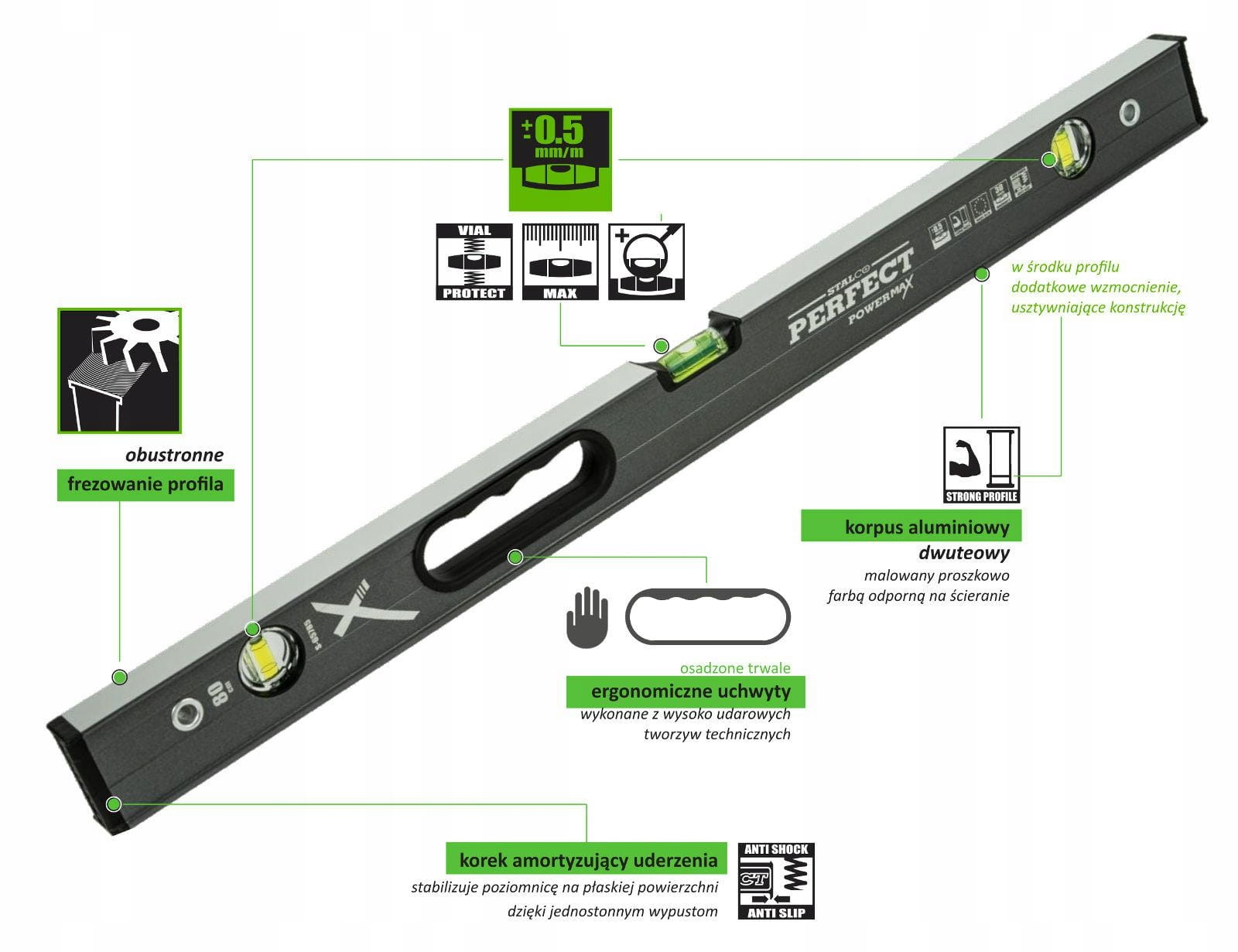 Poziomnica aluminiowa Powermax to niezbędny przyrząd dla każdego fachowca ceniącego jakość i solidne wykonanie. Poziomnica ma aluminiowy korpus dwuteowy zwiększający sztywność, w środku którego umieszczono dodatkowe wzmocnienie usztywniające. Wyposażona jest w 3 libelki (nie dotyczy S-65781), w tym powiększoną libelkę poziomu ułatwiającą odczyt z każdej strony. Dokładność pomiarowa poziomnicy to 0,5mm/1m. Proile przyrządu są frezowane obustronnie w celu osiągnięcia większej dokładności. Ergonomiczne uchwyty (nie dotyczy S-65781), zapewniają wygodne trzymanie poziomnicy podczas pracy. Na końcach poziomnicy umieszczono korki z tworzywa amortyzującego uderzenia z jednostronnymi wypustami stabilizującymi poziomnicę na płaskiej powierzchni. W celu zapewnienia długiej żywotności urządzenia, poziomnica została pomalowana proszkowo trwałym i odpornym na scieranie lakierem.