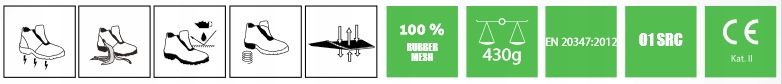 Cholewka obuwia została tak dobrana, aby kojarzyła się z obuwiem sportowym codziennego użytku. Podeszwę zaprojektowano specjalnie tak, aby była miękka, ultra lekka i przede wszystkim bardzo wygodna w użytku. Zapewniają wygodę i ochronę w różnych warunkach pracy. Obuwie posiada system anti-shock. Półbuty robocze posiadają nowoczesny design i chronią użytkownika podczas pracy z możliwością upadku ciężkich przedmiotów na palce.