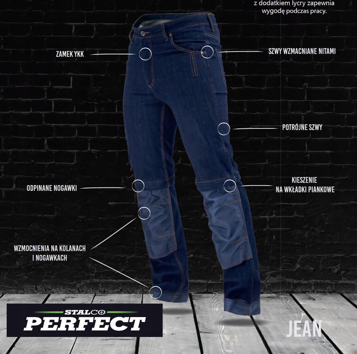 - Specjalnie zaprojektowane spodnie z dodatkiem Lycra zapewniają wygodę podczas pracy