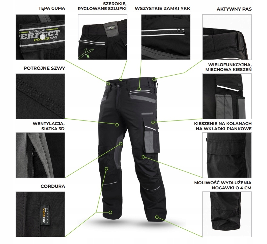 Do szycia spodni wykorzystano wysokiej jakości elastyczny materiał o charakterystyce softshellu. Dodatkowo w spodniach zamontowano aktywny pas z podwyższonym stanem z tyłu. Dzięki temu komfort użytkowania jest wysoki nawet przy wielogodzinnej pracy w wymuszonej pozycji. Dodatkowo wykonano otwory wentylacyjne odpinane na zamek, które pozwalają na wypuszczanie nadmiaru wilgoci i ciepła.