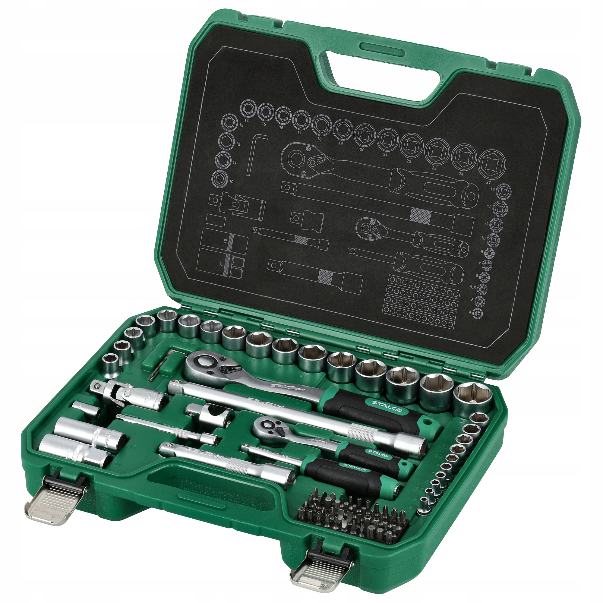 Zestaw kluczy nasadowych 1/2-1/4, 84 szt. STALCO to produkt dostarczany przez firmę STALCO. Oto podstawowe parametry tego zestawu: