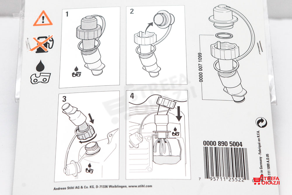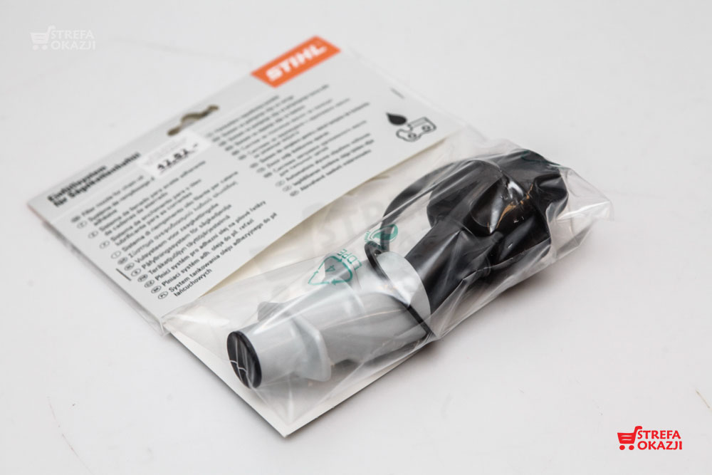 Lejek do tankowania oleju do pił łańcuchowych STIHL uniemożliwiający przepełnienie zbiornika lub rozlaniu. Specjalny zawór odcina dopływ cieczy w momencie wypełnienia zbiornika i chroni przed rozlaniem. Przeznaczony do kanistrów o pojemności do 3l.