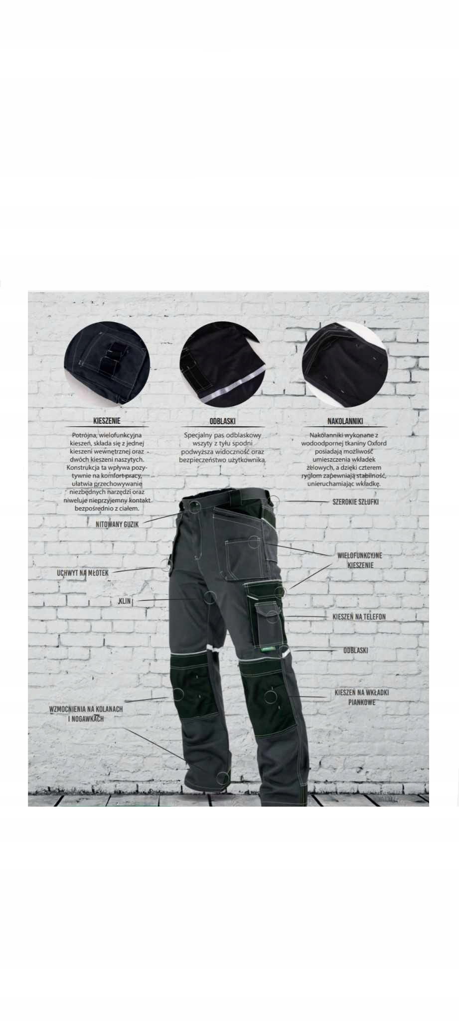 Monterskie spodnie robocze wzmocnione z tkaniny Oxford 600D, która zabezpiecza i pozwala na dłuższe użytkowanie. Wszyta elastyczna guma w pasie i w szelkach poprawia komfort noszenia a dodatkowe rygle zabezpieczają najbardziej narażone miejsca na rozdarcie.