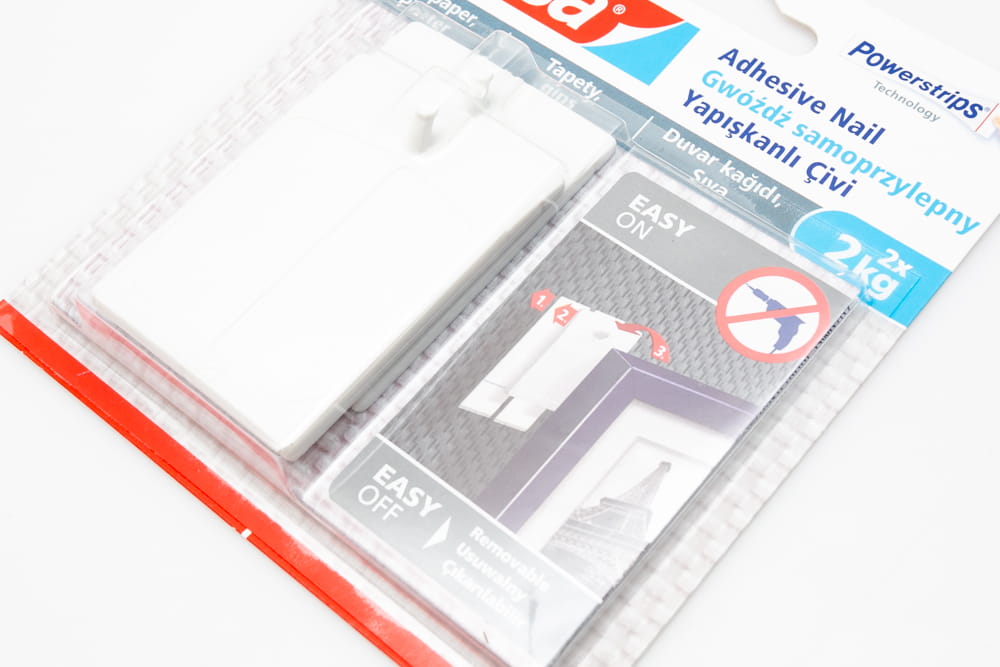 Gwóźdź samoprzylepny ułatwiający szybki montaż przedmiotów o masie do 2 kg. Do montażu przedmiotów dekoracyjnych na powierzchniach delikatnych (tapeta, tynk).