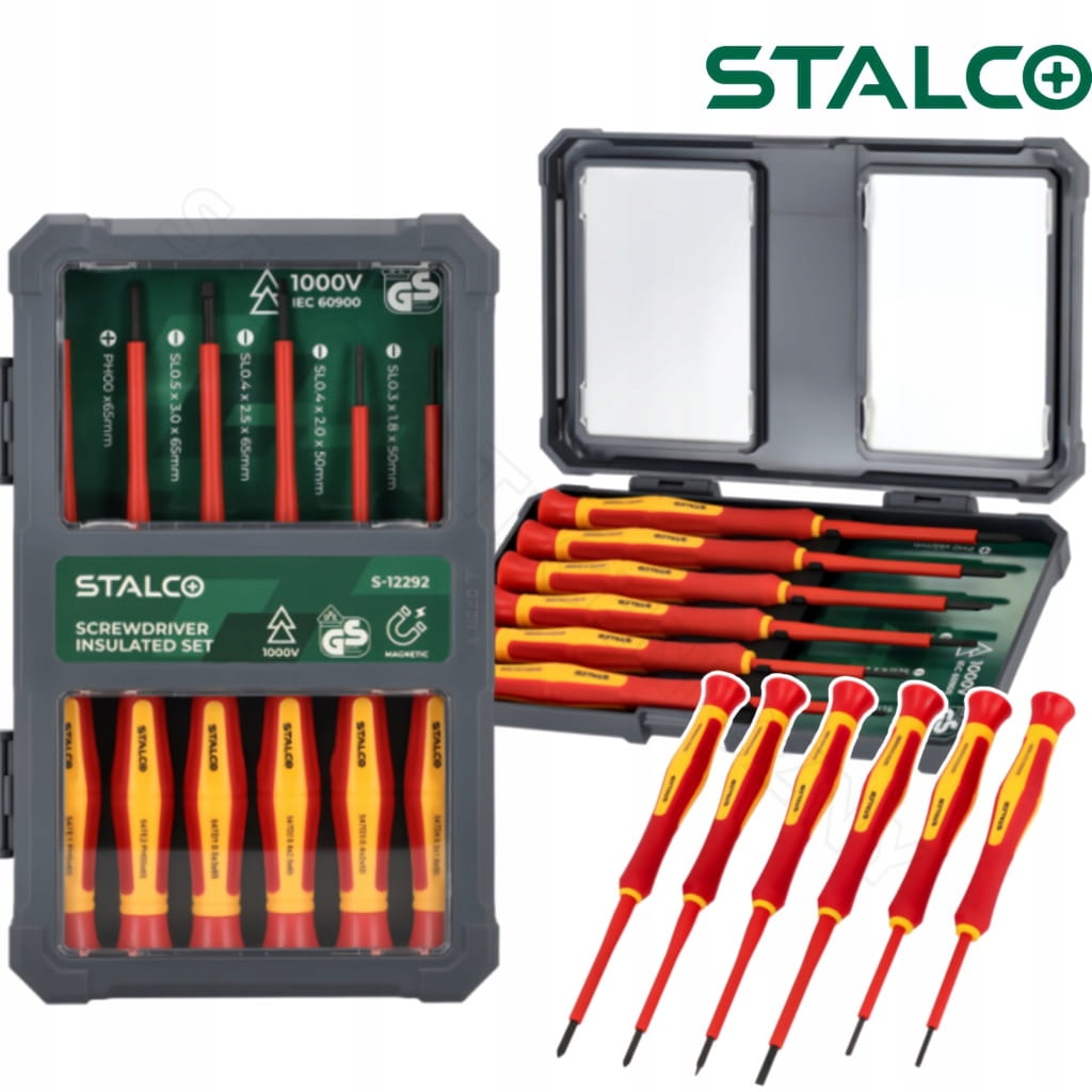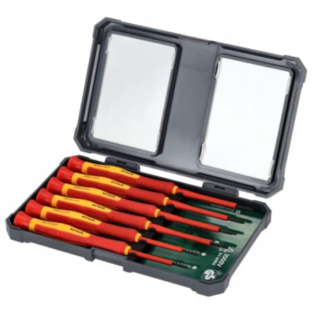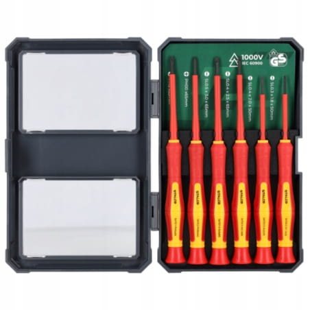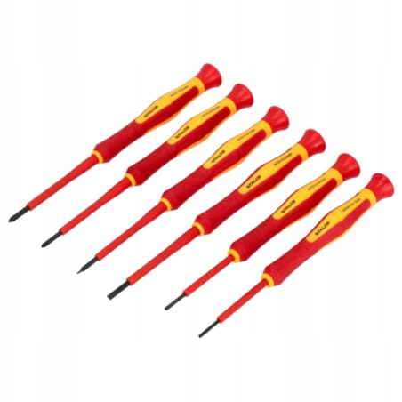 - Zestaw zawiera wszystkie najpopularniejsze rozmiary wkrętaków do precyzyjnych prac pod napięciem.