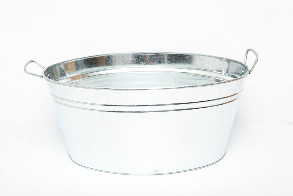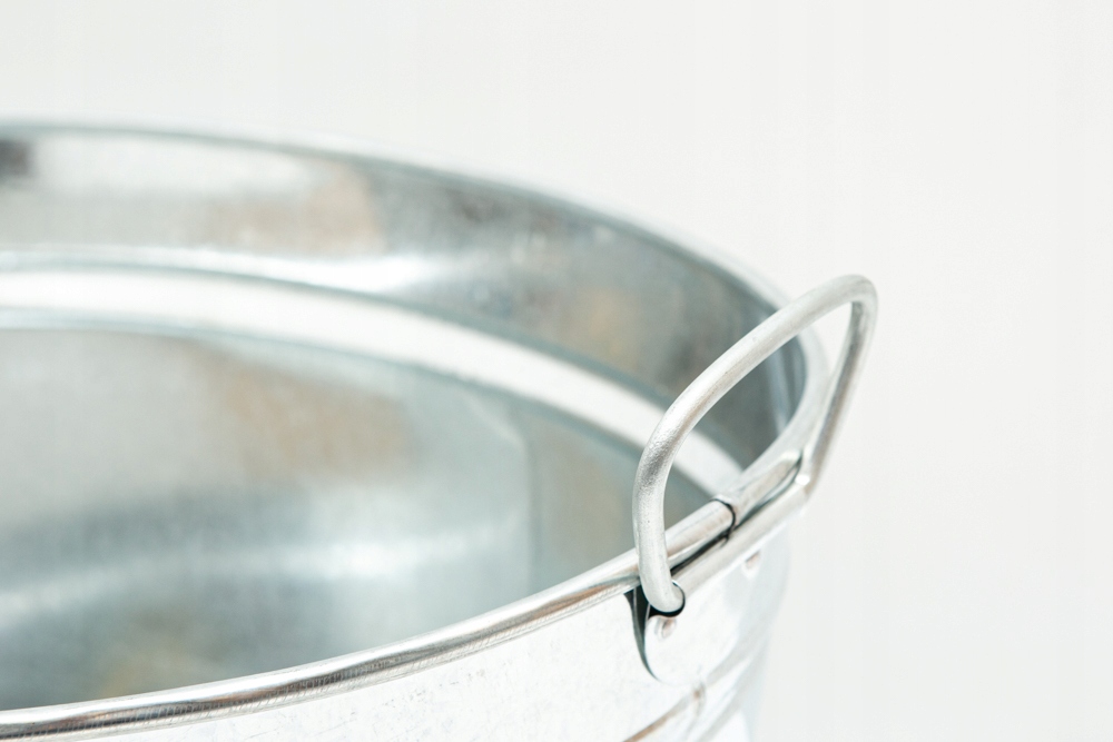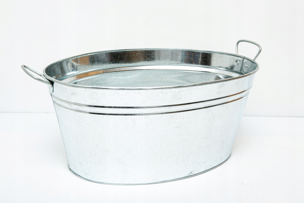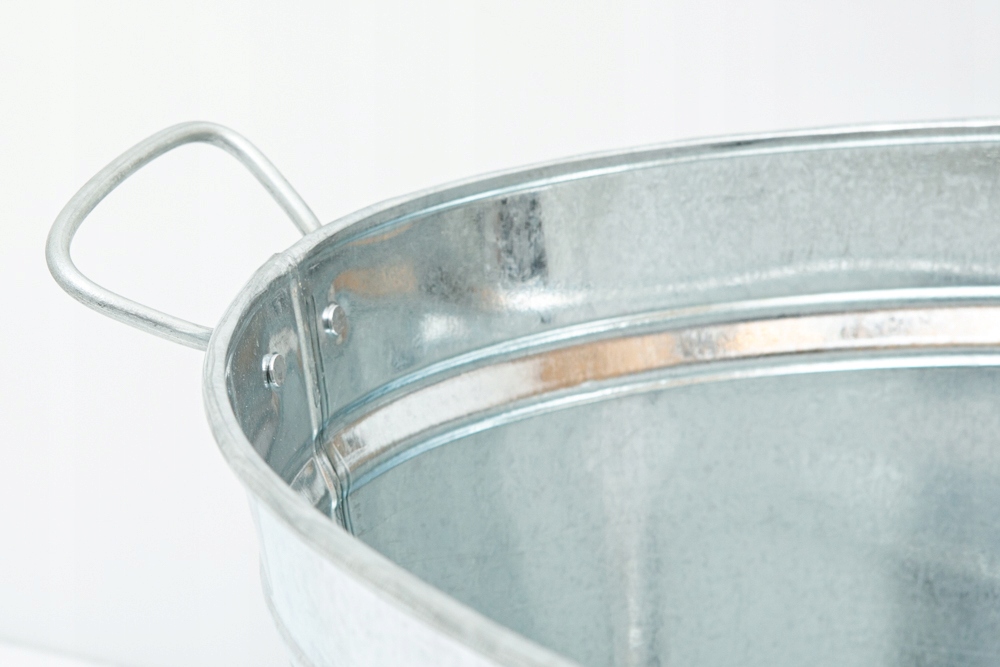Balia cynkowa z uchwytami do przenoszenia po obu stronach. Wanienka jest w kolorze ocynku