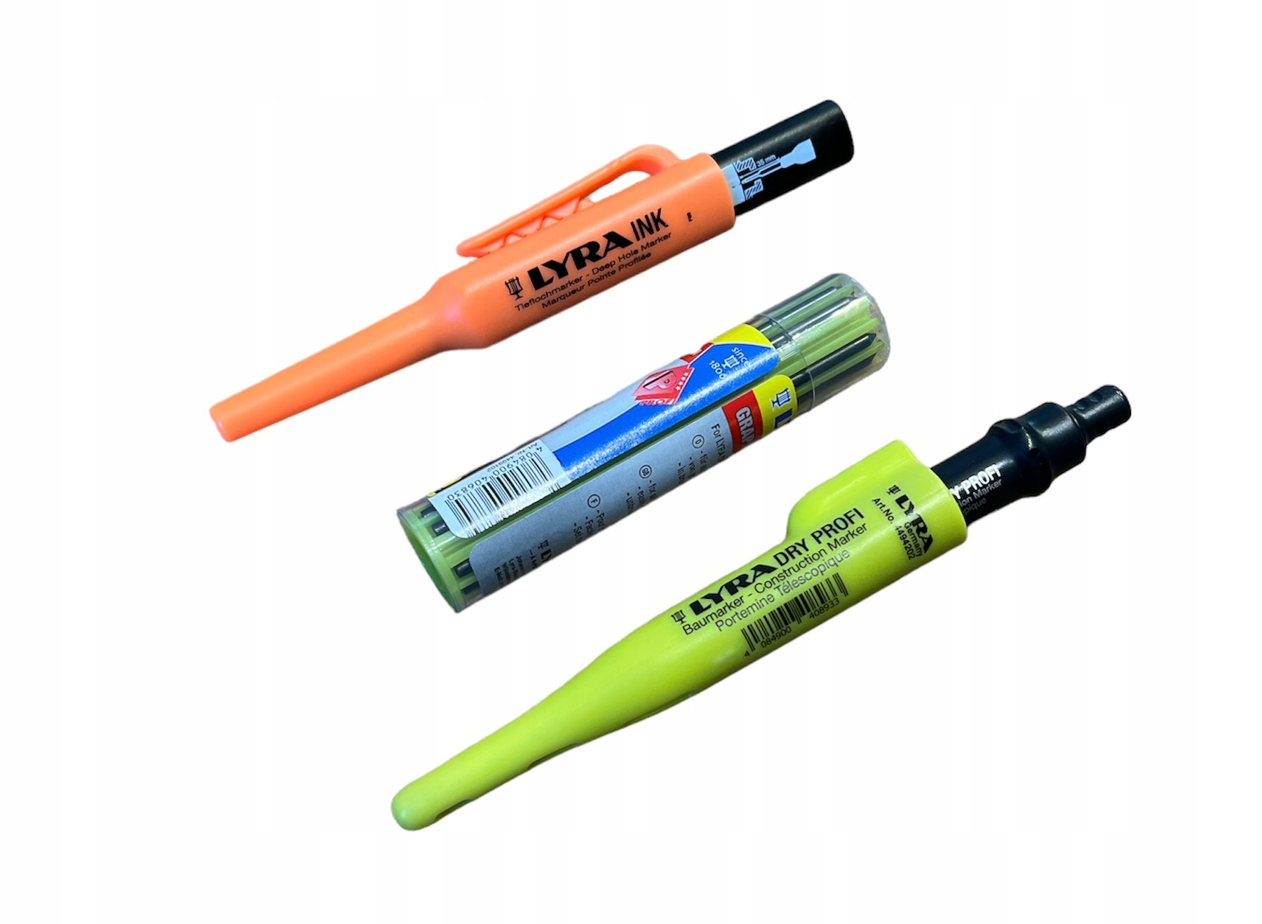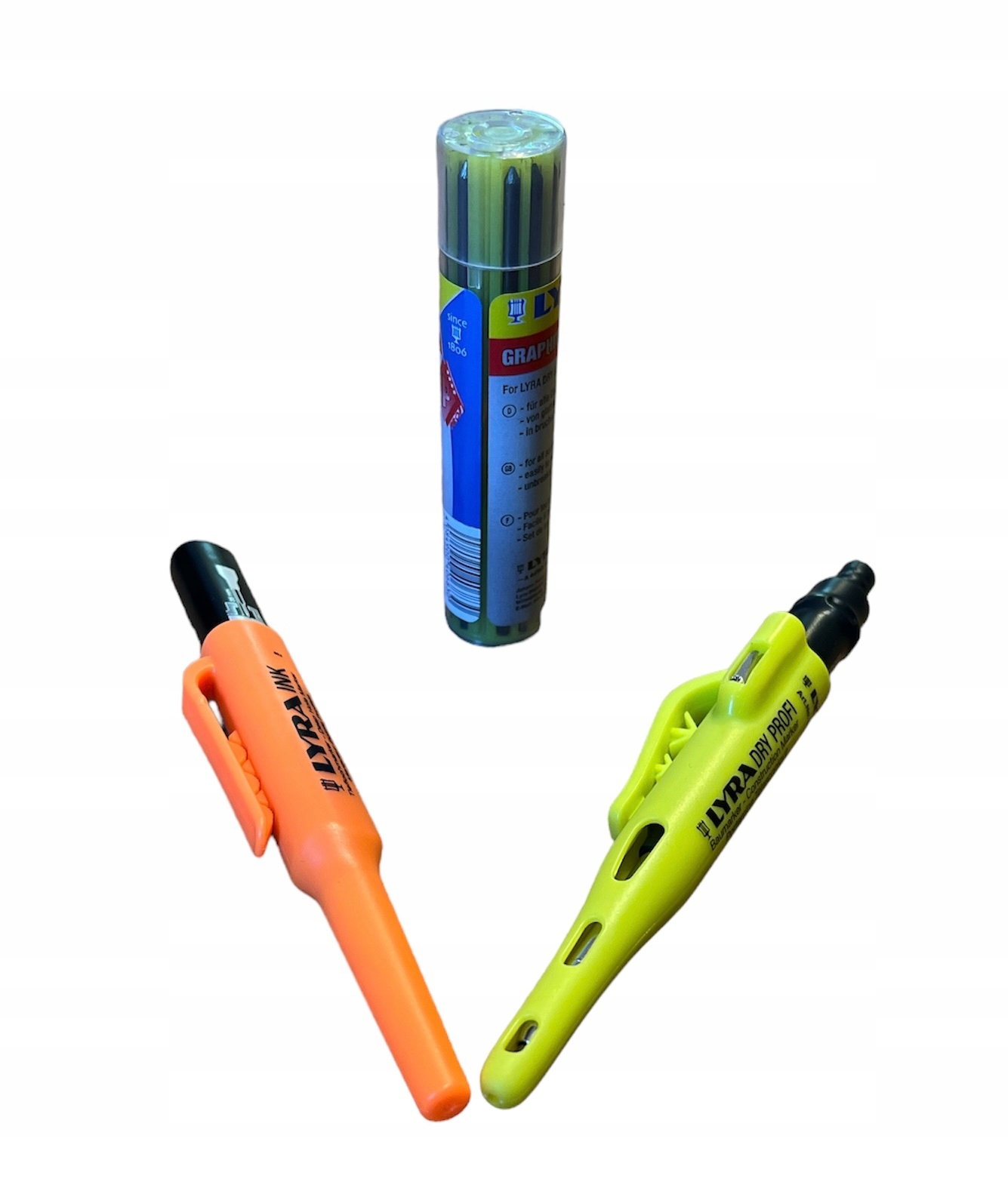 Lyra Dry Profi to prosty w budowie znacznik który pomaga podczas wszelkich prac budowlanych, stolarskich, instalatorskich oraz podczas domowego majsterkowania. Ołówek został wyposażony w mechanizm automatycznego wysuwania wkładu po wciśnięciu przycisku na jego górnej części. Dzięki temu jest łatwy w obsłudze, nawet jedną ręką. Znacznik ten posiada także zintegrowaną temperówkę zlokalizowaną w kaburze. LYRA wyposażyła model DRY PROFI w zgrabną kaburę z zaczepem który możemy zamocować do spodni lub paska.