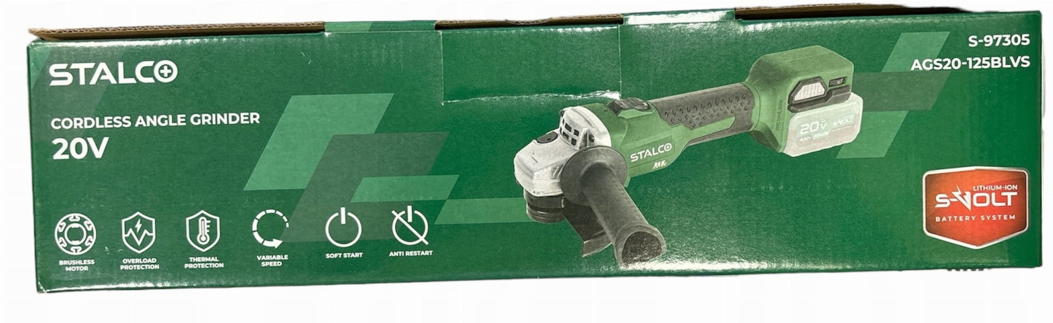 Szlifierka Akumulatorowa AGS20-125BLVS + STALCO ŁADOWARKA AKU S-VOLT BCS20-4A 1XSLOT + STALCO AKUMULATOR BATERIA 20V 8AH BLS20-8AH S-VOLT