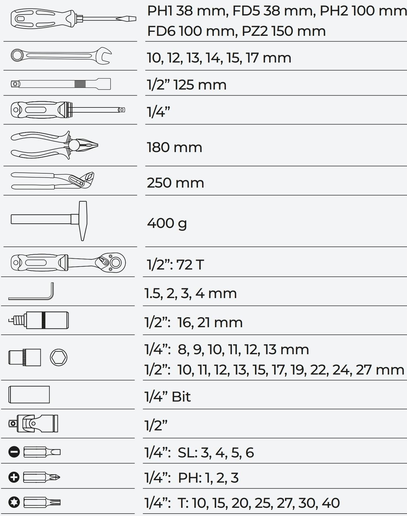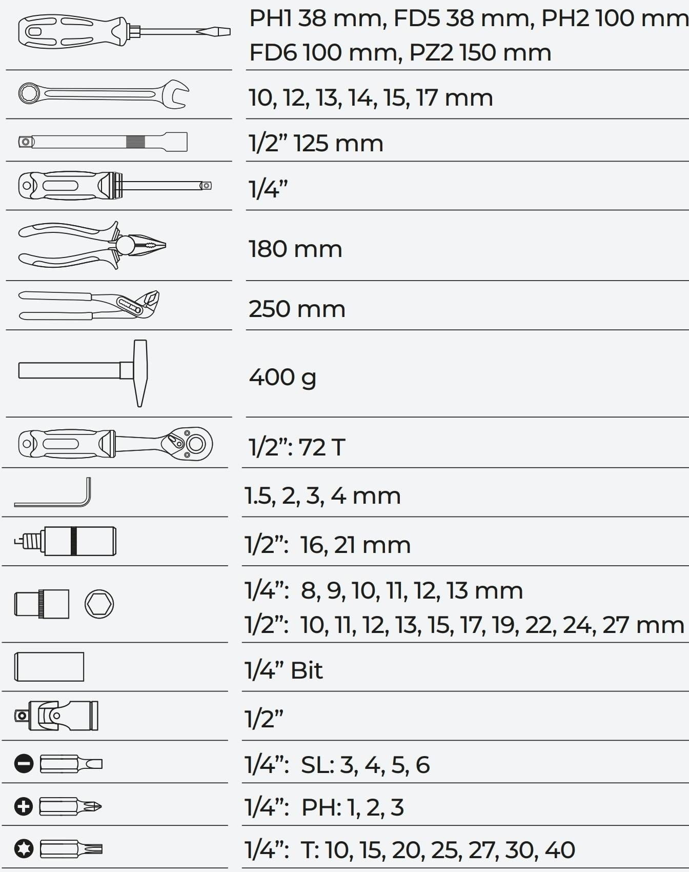 - Zapakowane w wytrzymałą walizkę z tworzywa sztucznego z przegrodami na poszczególne narzędzia