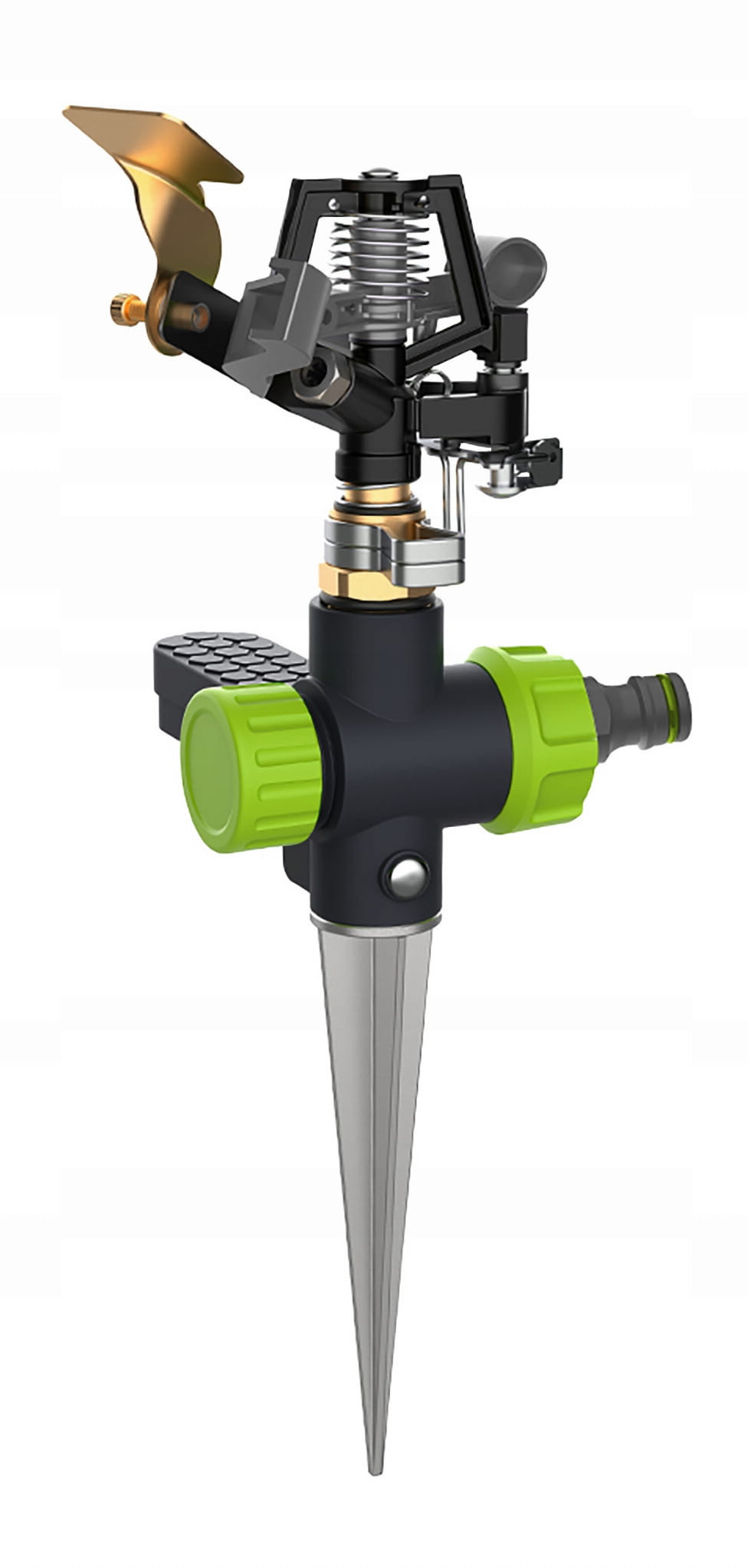 Szpilka: Metalowa szpilka stanowi podstawę zraszacza, umożliwiając łatwe i stabilne umocowanie go w ziemi. Szpilka pozwala na łatwe przenoszenie zraszacza w różne miejsca, zapewniając tym samym wszechstronność w obszarze jego zastosowania.